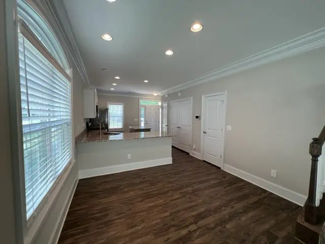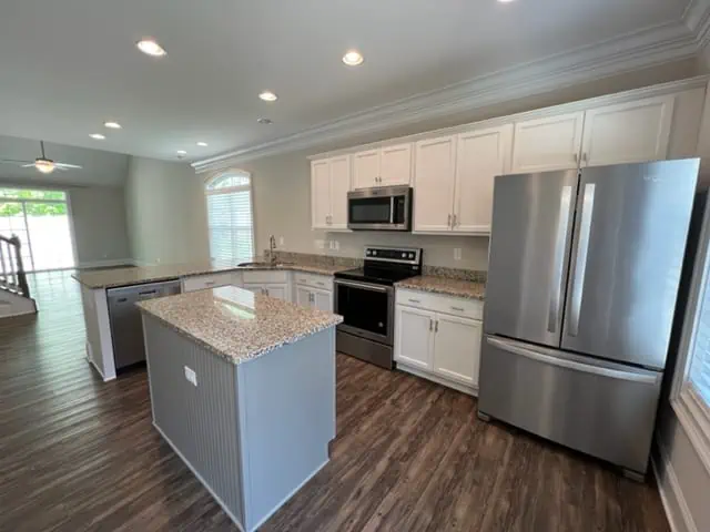 Marathon Property Solutions Presents: 52 Pisgah Forest Circle, Greensboro, NC 27455: Gorgeous end unit town home in Pisgah Forest community. Featuring 3 bedrooms, 2 ½ baths plus loft. Stunning kitchen with granite countertops, kitchen island, pantry, breakfast bar. Laundry area off kitchen & washer/dryer is included. Dining area open to spacious living room with built-ins and high ceilings. Luxury wood plank flooring on main level, carpet upstairs. Oversized fenced back patio. Primary bedroom on main level with vaulted ceilings, dual closets, full bath. Upstairs features loft, two additional bedrooms plus full bath. One-car garage. Two car maximum & street parking is prohibited. Located in front of small pond. Convenient to shopping, restaurants, parks, and more. Available now!