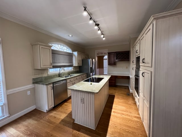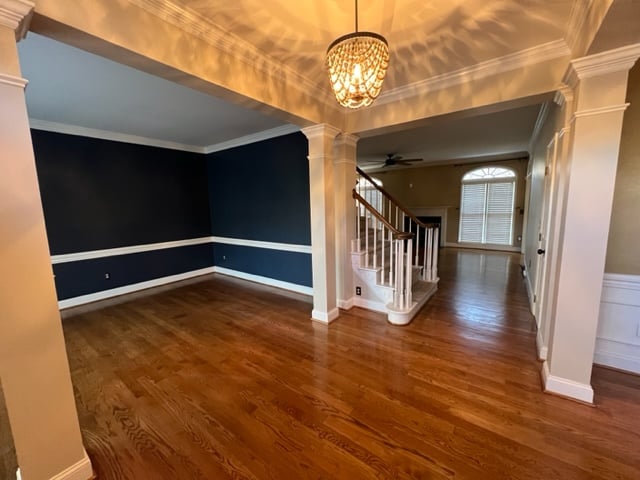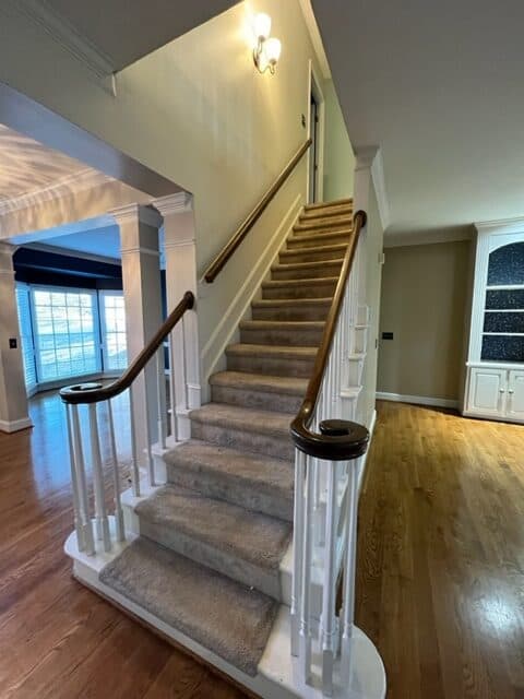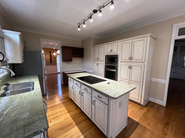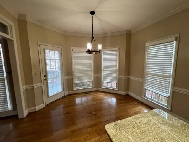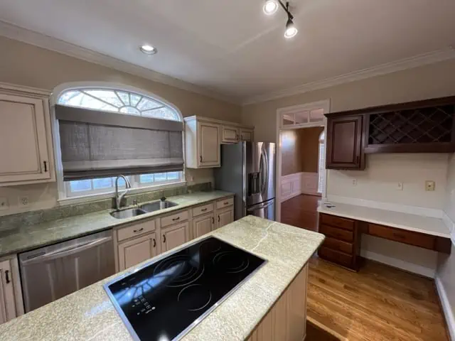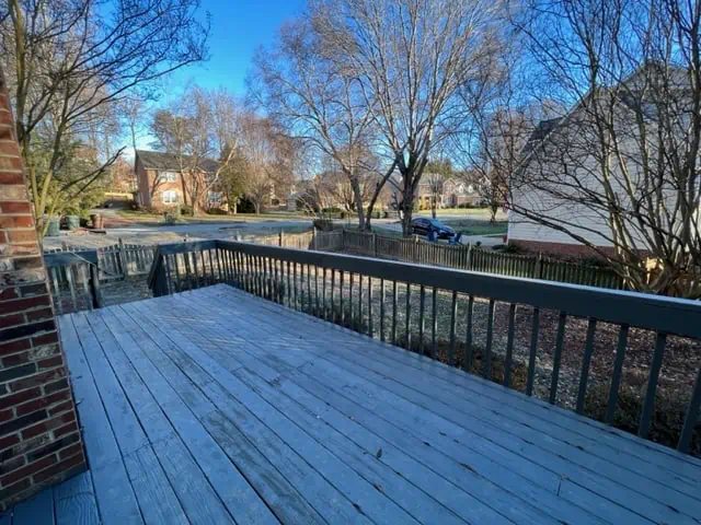 Marathon Property Solutions Presents: 5506 Harbor Gate Court, Greensboro, NC 27455: Two story brick home on corner lot! 5 bedrooms, 3 ½ baths. Entry foyer, formal living & dining rooms. Updated light fixtures. Hardwood floors on main level. Kitchen has updated cabinets, wine bar area, stainless steel appliances, granite countertops, island with cooktop. Fenced back yard with deck & fire pit. Huge den with built-in cabinets & wet bar, gas log fireplace. Main level laundry room with tile flooring & laundry folding table. All bedrooms are on second floor. One guest bedroom has walk-in closet and full bath. Two additional guest bedrooms are spacious. Primary bedroom has deep walk-in closet, primary bath with dual vanity, garden tub, separate shower. Fifth bedroom is attached to primary bedroom, would make a great nursery or office. Walk-in attic. Attached 2 car garage. Available now!